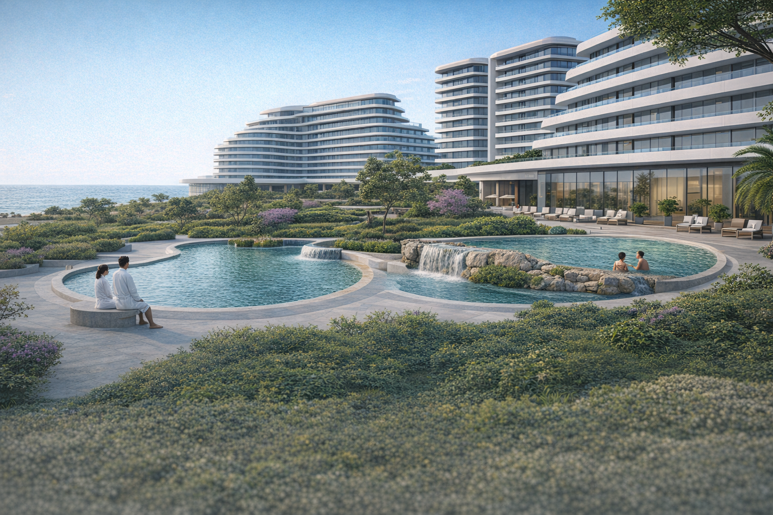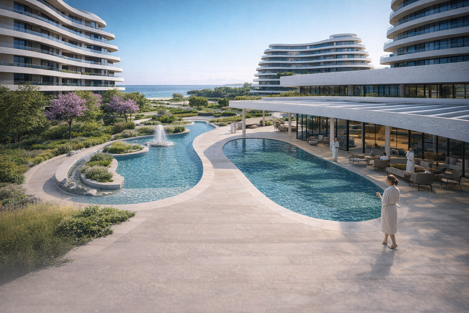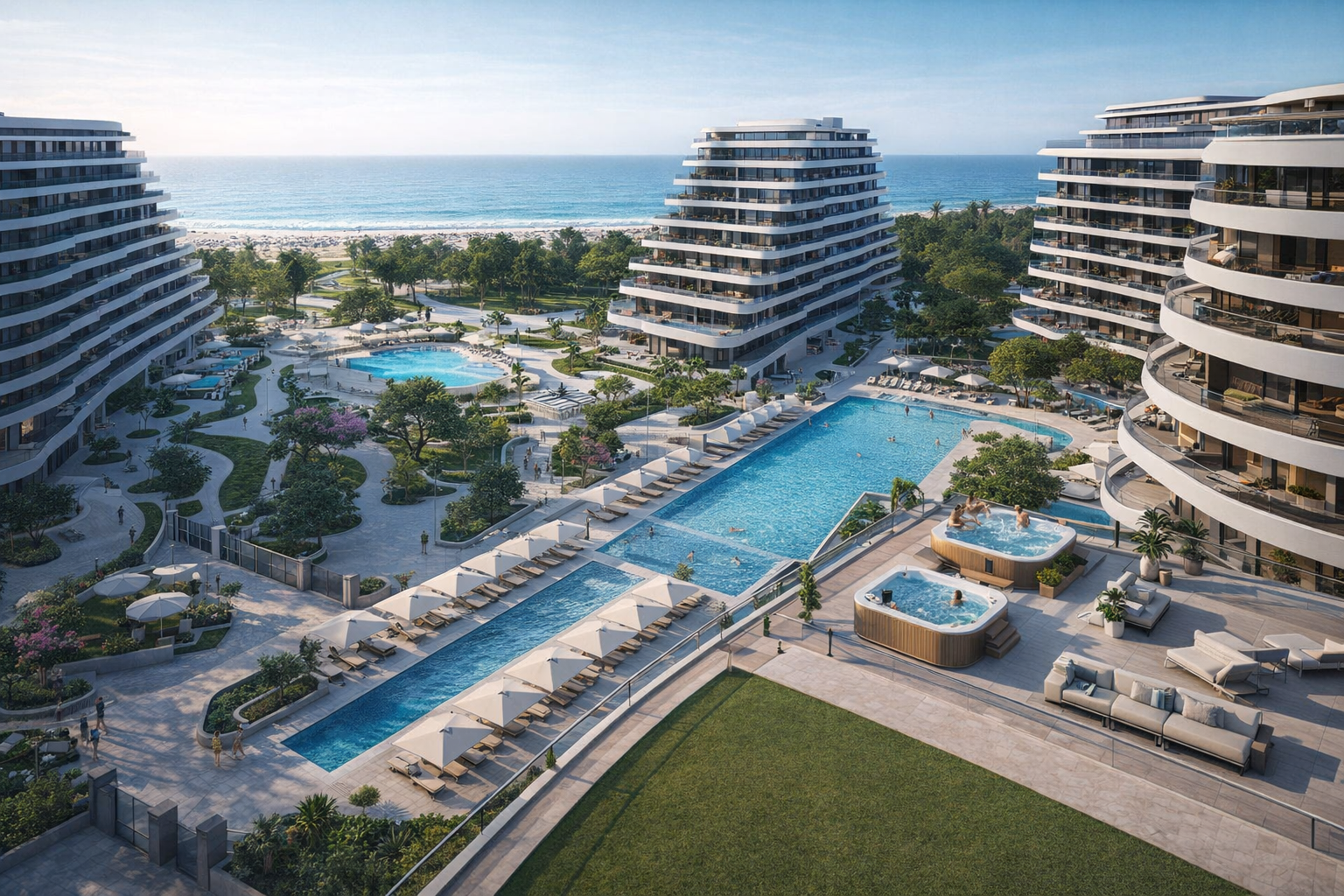 Все необходимое для курортной жизни: 3 бассейна и террасы с джакузи, парки, прогулочные зоны и скверы, приватная охраняемая территория и безопасность 365/24 и не только